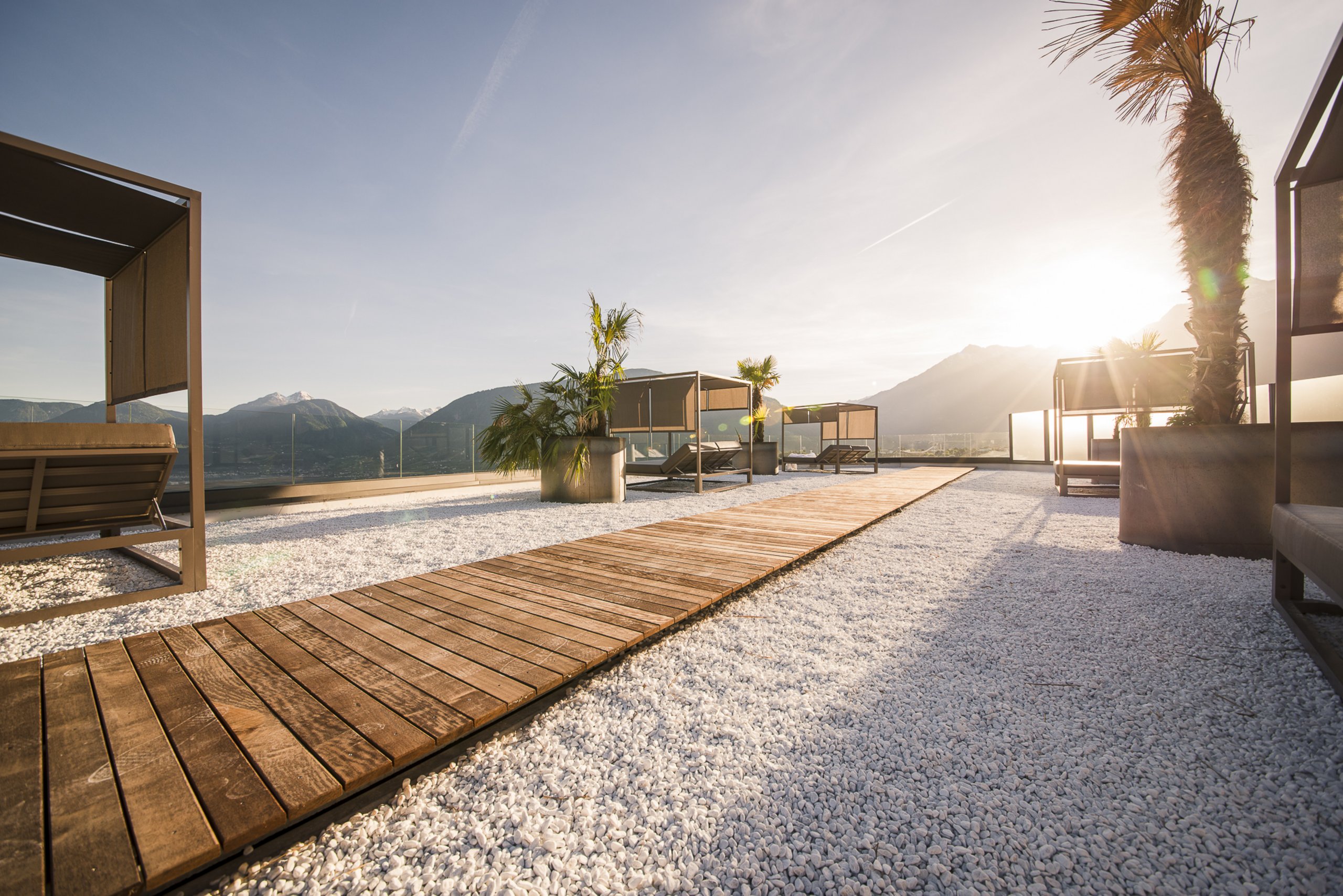 Chi ha già soggiornato all’Eschenlohe non può che amarla e portarla nel cuore. Stiamo parlando della nostra Sky lounge per soli adulti con panorama a 360°. Godetevi i caldi raggi del sole durante la giornata, e la sera, sorseggiate un buon calice di vino davanti al mare di luci della città termale di Merano.